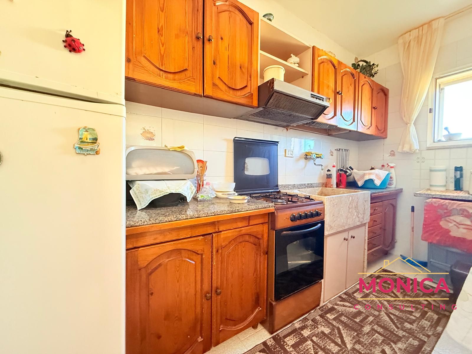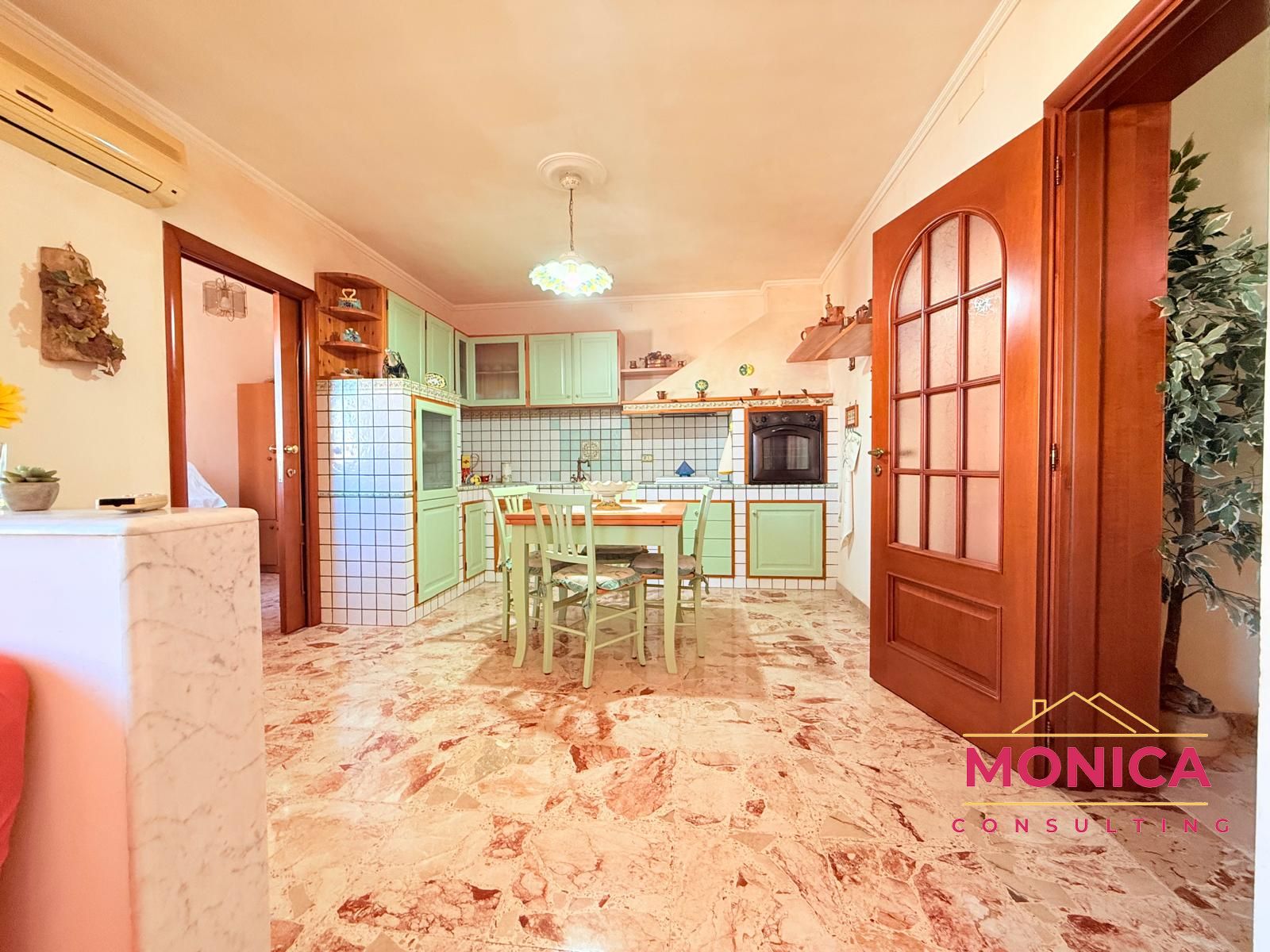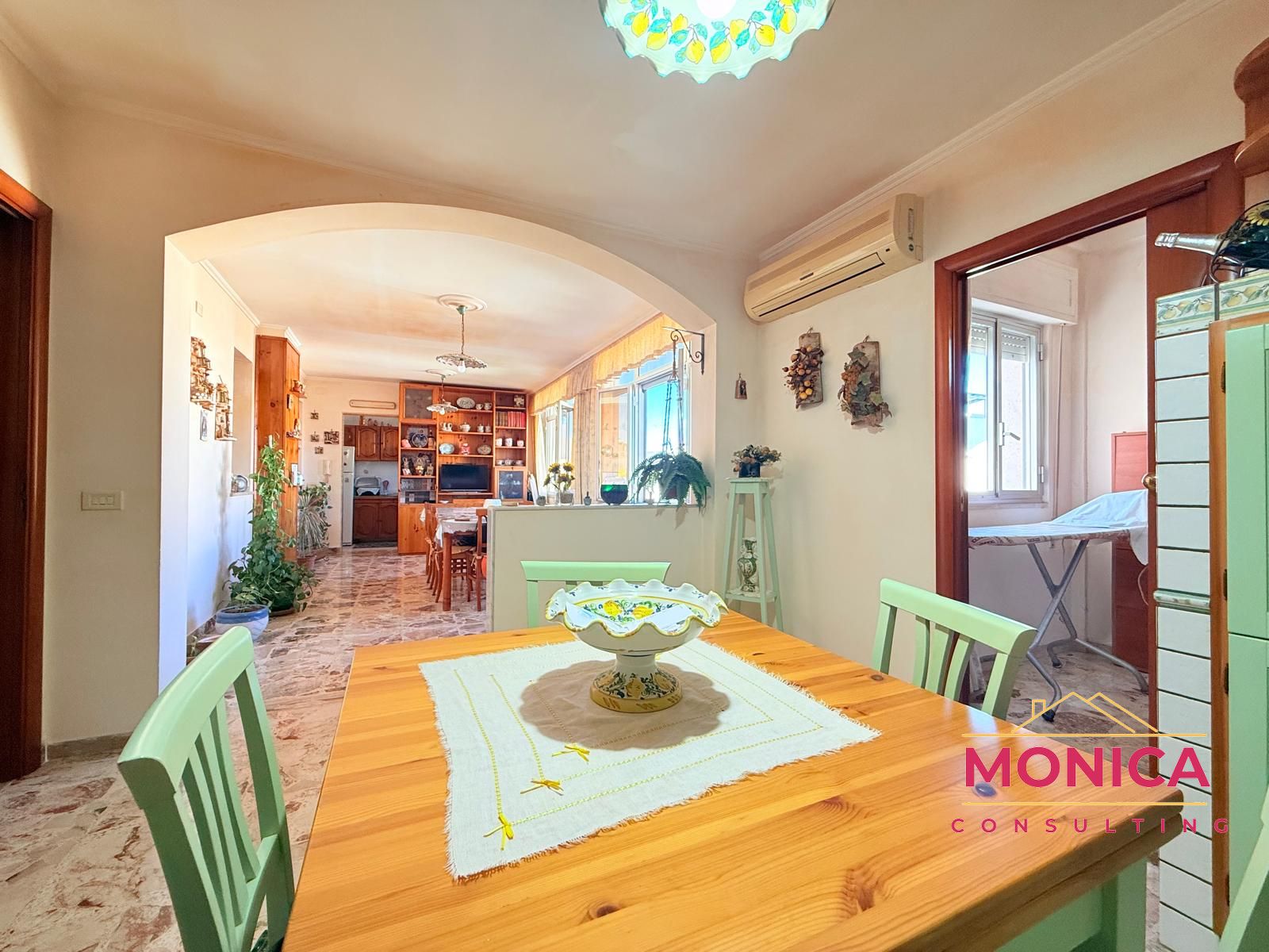 L’immobile, spazioso e ben distribuito, accoglie con un comodo disimpegno che conduce alla zona giorno, composta da una cucina in muratura con ampia veranda chiusa, un pratico cucinino e una funzionale lavanderia.